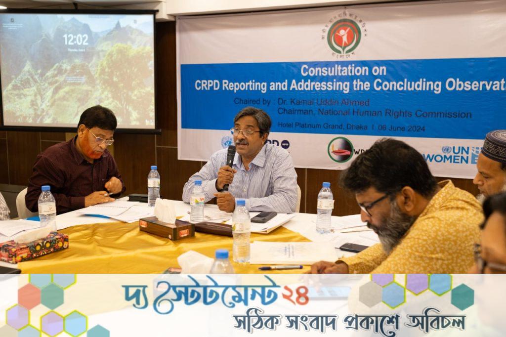 আজ ৬ জুন, ২০২৪ তারিখ রাজধানীর বনানীর ‘হোটেল প্লাটিনাম গ্রান্ডে’ জাতীয় মানবাধিকার কমিশন, ইউএনপিআরপিডি, ইউএনউইমেন ও ডাব্লিউডিডিএফের যৌথ আয়োজনে Consultation on CRPD Reporting and Addressing the Concluding Observations শীর্ষক একটি সভা অনুষ্ঠিত হয়। সভায় জাতীয় মানবাধিকার কমিশনের মাননীয় চেয়ারম্যান ড. কামাল উদ্দিন আহমেদ সভাপতিত্ব করেন। এ সময় বিভিন্ন মন্ত্রণালয়, দপ্তর ও সংস্থার ঊর্ধ্বতন কর্মকর্তাগণ উপস্থিত ছিলেন।