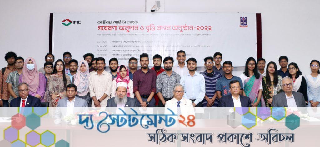 ঢাকা বিশ্ববিদ্যালয়ে আইএফআইসি ব্যাংক প্রতিষ্ঠিত ট্রাস্ট ফান্ডের ‘গবেষণা অনুদান ও বৃত্তি প্রদান অনুষ্ঠান-২০২২’ আজ ২৭ অক্টোবর বৃহস্পতিবার অনুষ্ঠিত হয়েছে। ঢাকা বিশ্ববিদ্যালয়ের নবাব নওয়াব আলী চৌধুরী সিনেট ভবনের কনফারেন্স রুমে আইএফআইসি ব্যাংক ট্রাস্ট ফান্ডের উদ্যোগে বিভিন্ন বিভাগের মেধাবী শিক্ষার্থীদের বৃত্তি ও গবেষণা অনুদান প্রদান অনুষ্ঠানে চেক হস্তান্তর করা হয়। আইএফআইসি ব্যাংক প্রতিবছর ট্রাস্ট ফান্ড থেকে বৃত্তি ও গবেষণার জন্য মেধাবী ও আর্থিকভাবে পিছিয়ে পড়া শিক্ষার্থীদের উৎসাহ প্রদানের জন্য অনুদান দিয়ে থাকে। এই বছর ২৫ জনকে গবেষণার জন্য অনুদান এবং ১৫ জনকে বৃত্তি প্রদান করা হয়েছে।