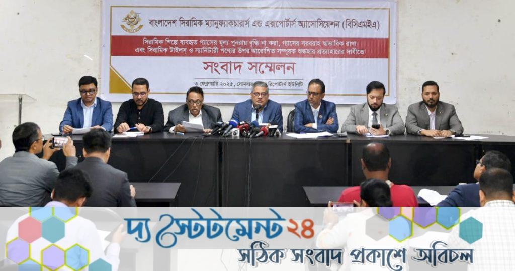 আজ ৩ ফেব্রুয়ারি ২০২৫ ঢাকা রিপোর্টার্স ইউনিটির নসরুল হামিদ মিলনায়তনে আয়োজিত এক সংবাদ সম্মেলন এসব দাবি জানান অ্যাসোসিয়েশনের ভারপ্রাপ্ত সভাপতি মইনুল ইসলাম। অ্যাসোসিয়েশনের অন্য ২টি দাবি হচ্ছে—সিরামিক শিল্পে গ্যাসের সরবরাহ স্বাভাবিক রাখা এবং সিরামিক টাইলস ও স্যানিটারি পণ্যের ওপর আরোপিত সম্পূরক শুল্কহার প্রত্যাহার করা।